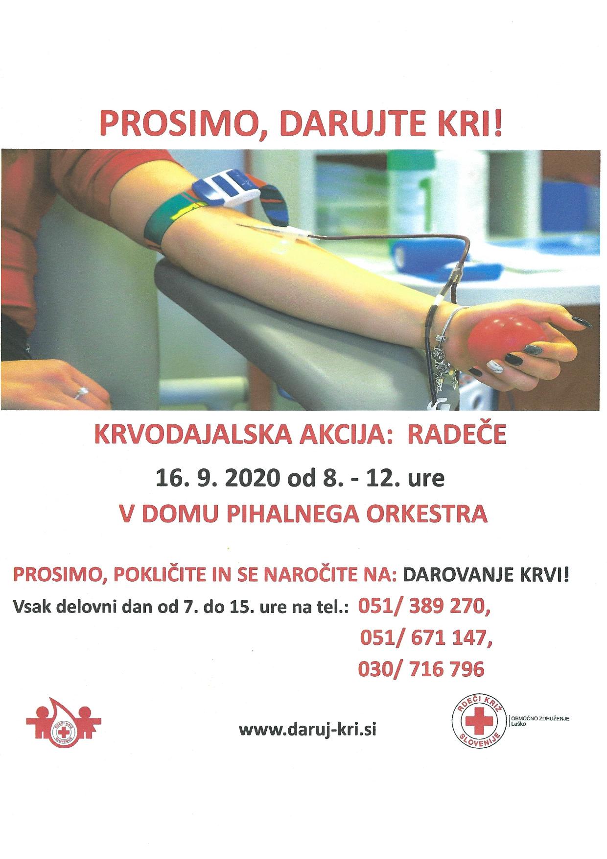 V sredo, 16. septembra bo v Domu PORP od 8. do 12. ure potekala jesenska krvodajalska akcija, so sporočili iz Območnega združenja Rdečega križa Laško-Radeče. Na priloženem vabilu so zapisane telefonske številke, na katere se kot krvodajalec lahko naročite, pod pogojem seveda, da ste zdravi.