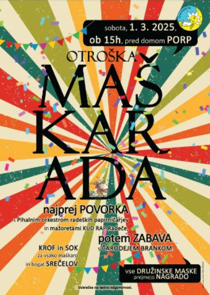 Preden nastopi letošnji pust, ki ga v letu 2025 obeležujemo 4. marca, torej čez dobre štiri dni, bo Društvo prijateljev mladine Radeče pripravilo tradicionalno otroško maškarado, ki bo jutri, v soboto, 1. marca 2025 od 15h dalje, prav tako pa bo veselo tudi v Vrhovem, kamor tamkajšnje prosvetno društvo vabi v nedeljo, 2. marca od 15h dalje.