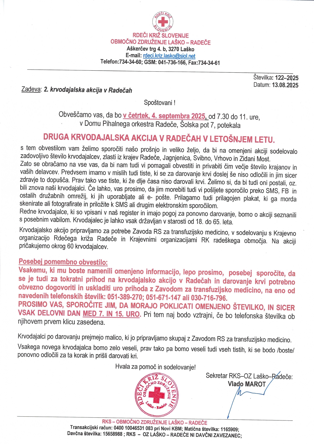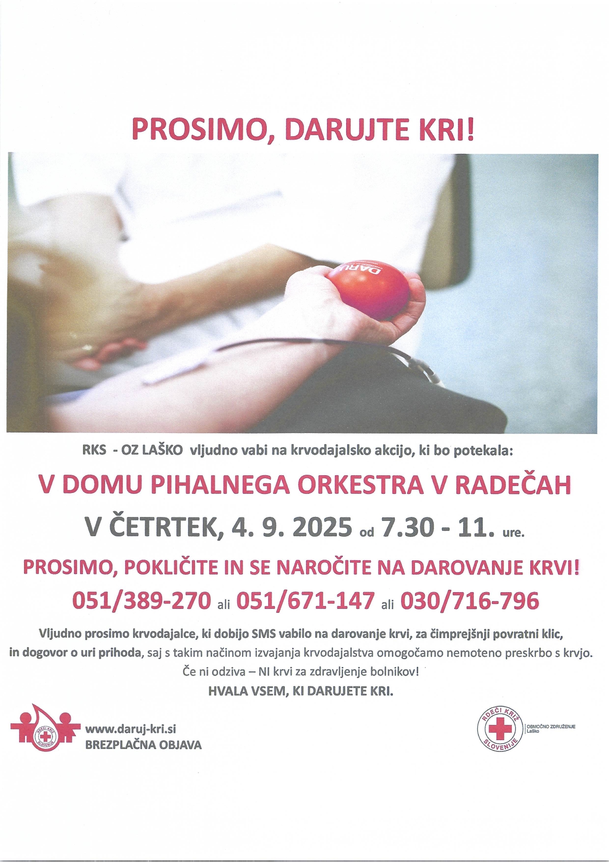 Območno združenje Rdečega križa Laško-Radeče in Krjevna organizacija Rdečega križa Radeče vljudno vabita na krvodajalsko akcijo, ki bo v četrtek, 4. septembra 2025, od 7.30 do 11. ure, v Domu Pihalnega orkestra radeških papirničarjev Radeče. Vse, ki se nameravate akcije udeležiti prosijo, da se za udeležbo predhodno naročite na eni od naslednjih številk Zavoda RS za transfuzijsko medicino: 051-389-270 ali 051-671-147 ali 030-716-796.