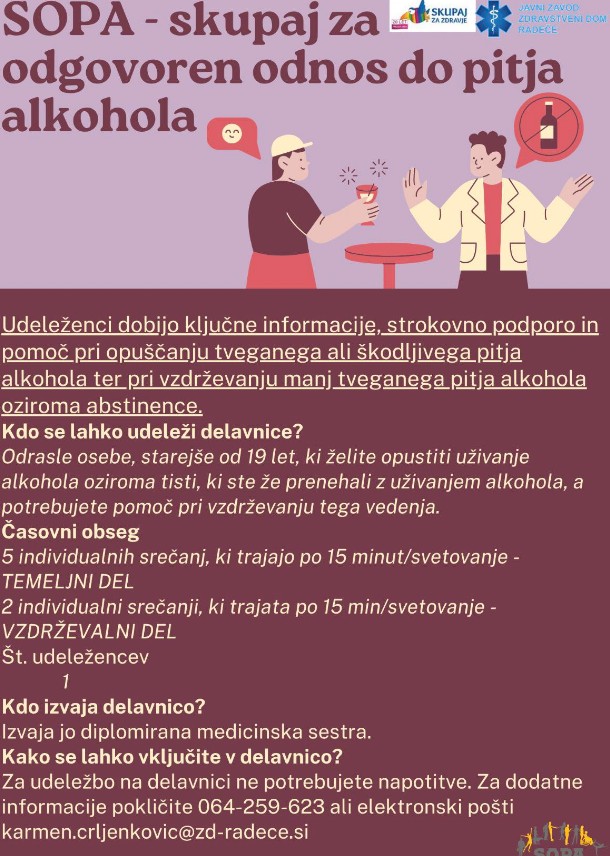 Razmišljate o zmanjšanju ali opustitvi pitja alkohola? Zdravstveni dom Radeče nudi udeležencem pridobitev ključnih informacij, strokovno podporo ter pomoč pri opuščanju tveganega ali škodljivega pitja alkohola ali pri vzdrževanju abstinence.