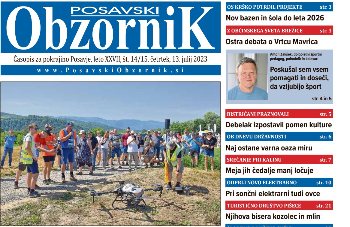 Danes je izšla dvojna številka 14/15 časopisa za regijo Posavje Posavski obzornik. V njem boste že na strani 2 našli najbolj vročo temo ta hip - opis postopkov v povezavi z rastlinjaki - sončne elektrarne, ki jo je Smilja Radi naslovila Načrtovana gradnja rastlinjakov razburila krajane Počakovega in v prispevku povzela tudi vsebine junijske občinske seje, Anja Novak je skozi svoje oči v anketi (str. 4) razkrila, brez česa na dopustu ne gre, na strani, ki jo pripravlja Občina Radeče - tokrat nosi številko 8, pa je zapis o proslavi na Brunku, sprejemu župana za najbolj uspešne učence in o Počitniških igrarijah 2023.