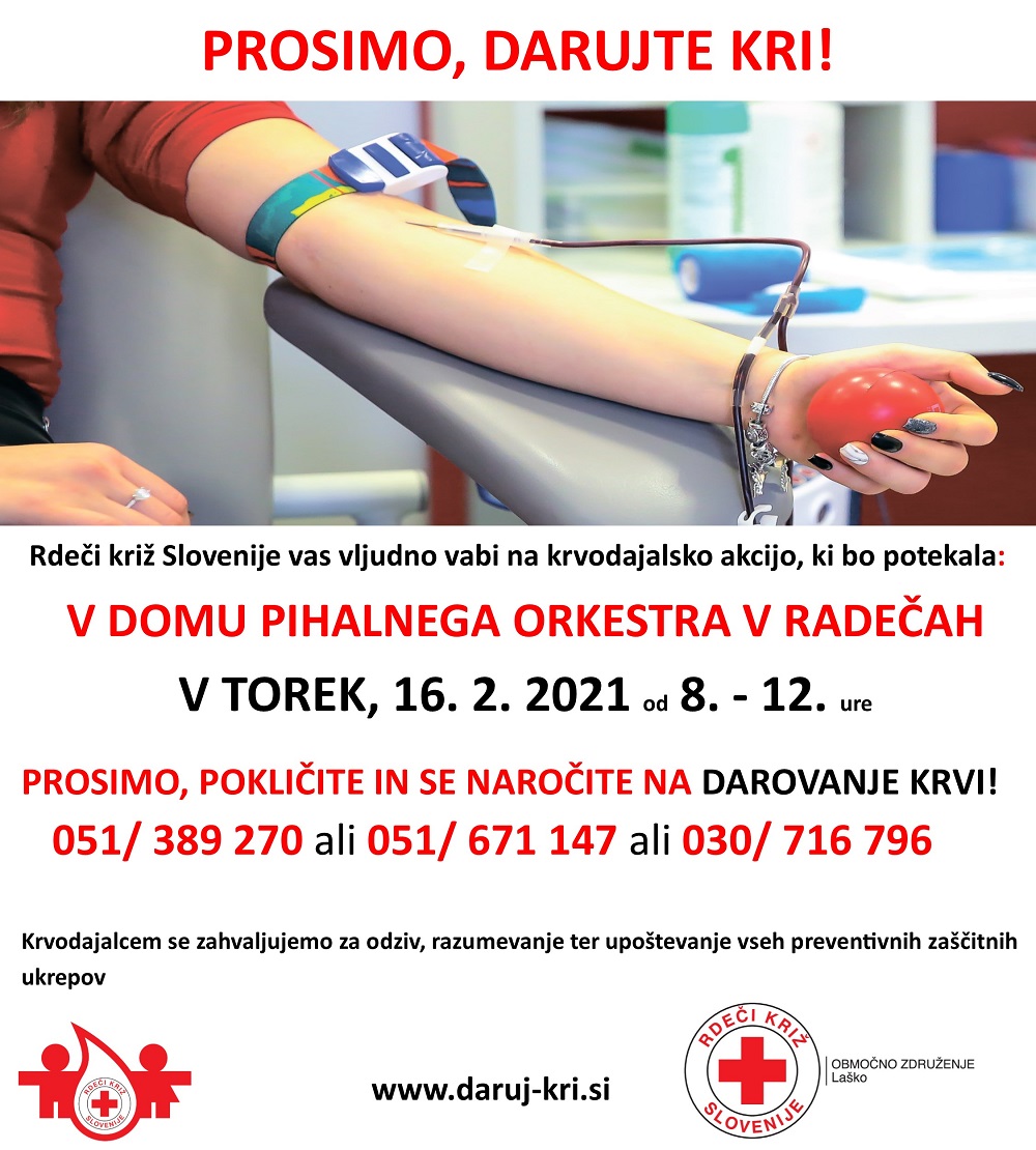 Rdeči križ Slovenije - Območno združenje Laško-Radeče bo organiziralo, Zavod Republike Slovenije za transfuzijsko medicino pa izvedel prvo letošnjo krvodajalsko akcijo izmed skupno dveh - in...
