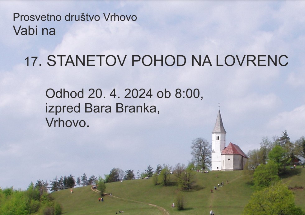 Prosvetno društvo Vrhovo vabi k udeležbi na Stanetovem pohodu, na katerem bo pot vodila od Vrhovega pa do botaničnega bisera - Lovrenca. Stane Martinšek, po katerem je pohod poimenovan, je bil prijatelj, sovaščan in prizadeven član Prosvetnega društva Vrhovo, ki je pohodnike vsako leto popeljal po njemu lastno začrtani poti skozi travnike in gozdove do Lovrenca. Pohod po Stanetovi trasi bo potekala že 17-ič po njegovi smrti. Zbor in nato odhod proti Lovrencu bo ob 8. uri zjutraj izpred Bara Branka v Vrhovem. Vabljeni!