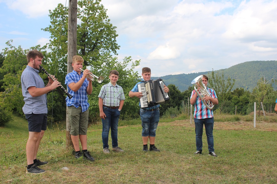 Razveseljiv dogodek pod Novakovim kozolcem, na prečnih drogovih katerega so skozi fotografije različnih faz projekta in zapise priimkov Zavratčanov odsevali sosedska sloga, sodelovanje in zasledovanje istega cilja v skupno dobro, so popestrili učenci Glasbene šole Laško-Radeče bratje Jošt, Metod in Krištof Kavšek ter bratranca Žiga in Sebastjan Kmetič, ki so druženje na podeželju podkumskega območja razpoloženjsko še dodatno okrepili s poskočnimi melodijami.