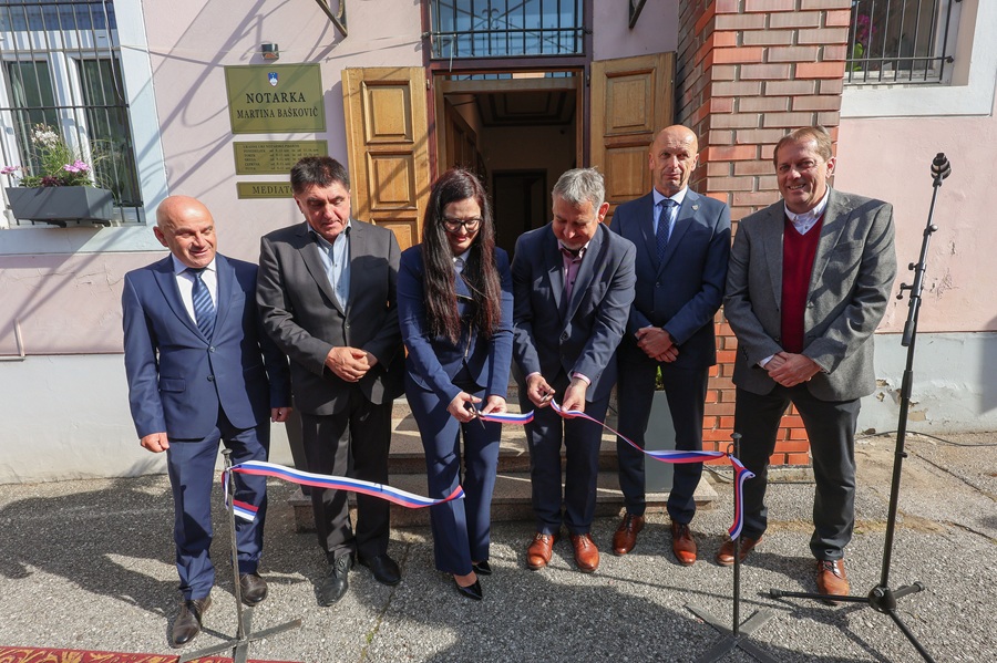 Sledil je prerez traku in otvoritev prenovljenih prostorov pisarne, katerega sta opravila notarka Martina Baškovič in župan Občine Sevnica Srečko Ocvirk, pri čemer so se jim pridružili župan Mestne občine Krško Janez Kerin, župan občine Radeče Tomaž Režun, župan občine Podčetrtek Peter Misja in župan občine Šmarješke Toplice Marjan Hribar.