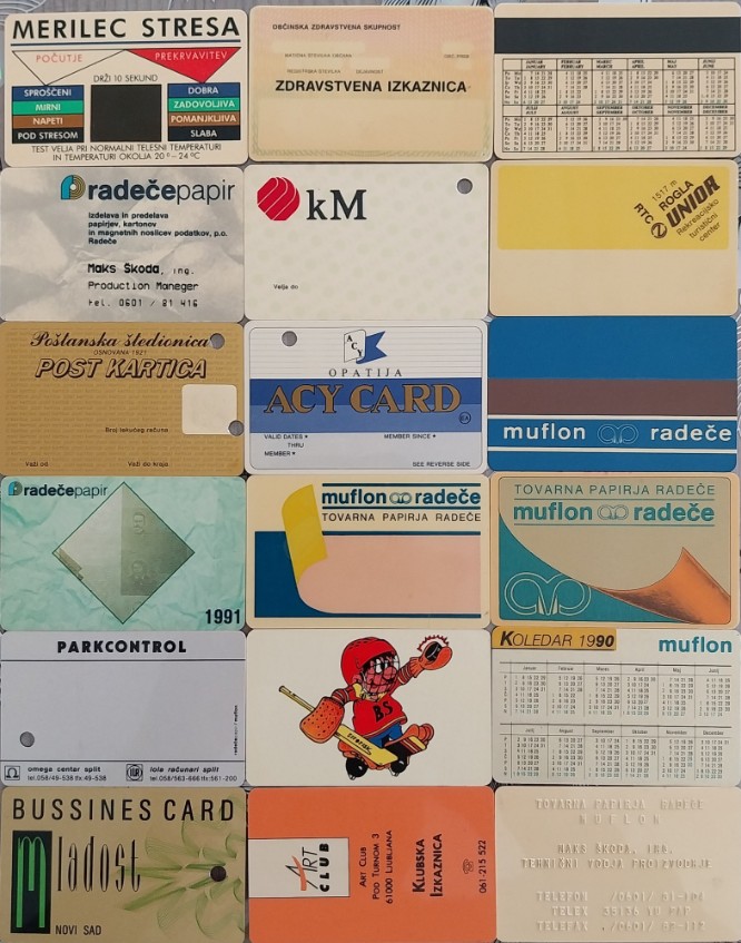 Pregled raznolike bere plastičnih kartic proizvajalca Muflon; vir: Jure Jaklevič (Radeče nekoč; izvorne primerke hrani Jelena Škoda)