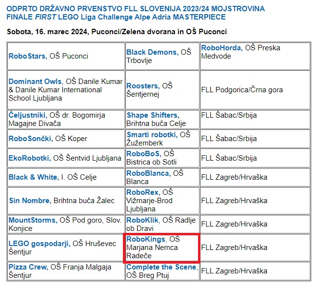 Slovenskim ekipam se bodo na Odprtem državnem prvenstvu FLL Slovenija/Finalu regije Adria pridružile najboljše ekipe iz srbskega, hrvaškega in črnogorskega turnirja.