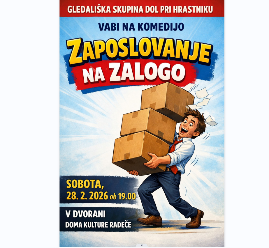 V soboto, 28. februarja ob 19.00 prihajajo v Radeče igralci iz sosednjega Hrastnika s predstavo ZAPOSLOVANJE NA ZALOGO. Vstopnina: prostovoljni prispevki. VABLJENI!