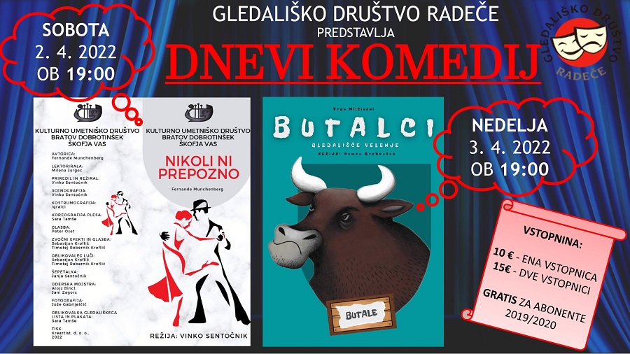 2. aprila ob 19.00 bodo prišli v goste v Radeče člani KUD Bratov Dobrotinšek iz Škofje vasi s komedijo Nikoli ni prepozno.- 3. aprila ob 19.00 bo na gledališkem sporedu komedija Butalci v izvedbi Gledališča Velenje.