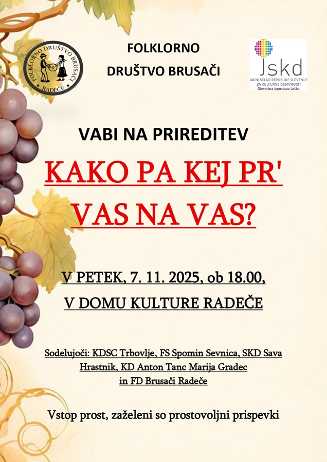 Dragi prijatelji folklore, plesa in domače pesmi! Jesen je čas, ko se narava umiri, ko zadiši po domačem in ko se v naših krajih spet zaslišijo plesni koraki, petje in zvoki harmonike. Tudi letos vam z velikim veseljem sporočamo, da Folklorno društvo Brusači Radeče pripravlja svojo tradicionalno jesensko prireditev z naslovom »Kako pa kaj pr' vas na vas'«.