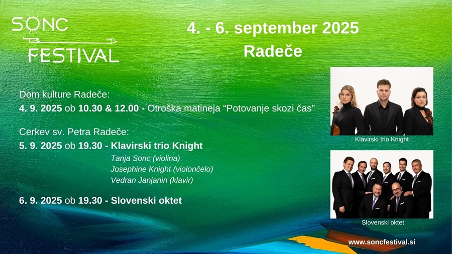 Po tem, ko je bil vse od ustanovitve leta 2016 vedno izveden v mesecu juliju (oz enkrat konec junija), se letošnji Sonc Festival ponovno odvija v jesenskem času, kot se je že lani prvič v septembrskem koncu tedna. Kot vselej se bo poslastica klasične glasbe začela z otroško matinejo in se nadaljevala s koncertnima večeroma v radeški cerkvi - letos nedeljskega sicer ne bo, bodo pa vrhunske melodije izvabljali iz instrumentov in grl tako v petek kot v soboto.