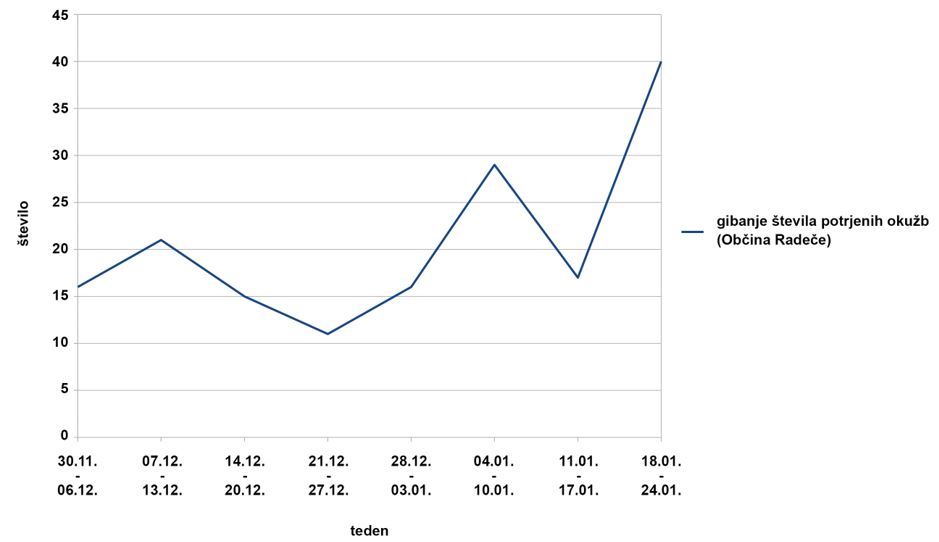 Grafični prikaz: Gibanje števila potrjenih okužb z virusom Sars-CoV-2 na območju Občine Radeče v minulih osmih tednih.