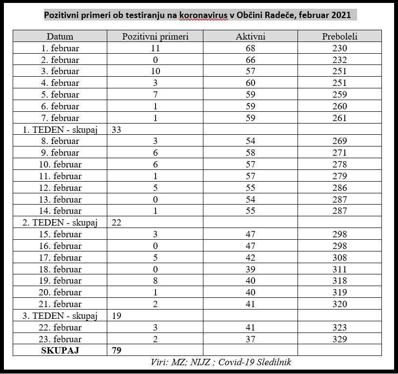 V občini Radeče smo v prvem tednu februarja v korona-statistiko zabeležili 33 pozitivnih primerov, v drugem tednu jih je bilo 22 in v tretjem 19. V ponedeljek so bili potrjeni trije primeri, ko se je testirani posamezniki izkazal za pozitivnega na koronavirus, včeraj pa sta bila takšna testirana dva. Kako je občina Radeče videti z vidika aktivnih, prebolelih in dnevno pozitivnih v tem mesecu, pa si lahko ogledate v spodnji preglednici.