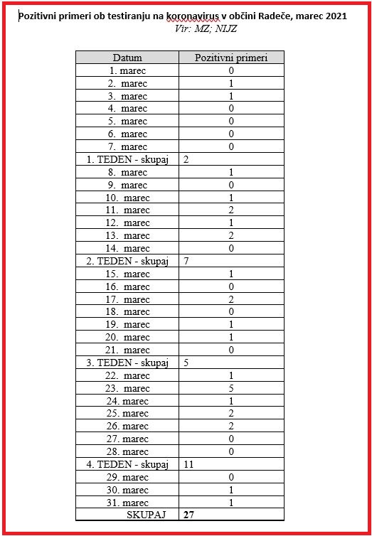 Po podatkih Nacionalnega inštituta za javno zdravje je bilo v Radečah v mesecu marcu 27 pozitivnih testov na koronavirus, do 1. aprila pa je koronavirusno bolezen prebolelo skupno 385 pacientov. Kakšno je bilo gibanje po posameznih dnevnih si lahko podrobneje ogledate v spodnji preglednici.