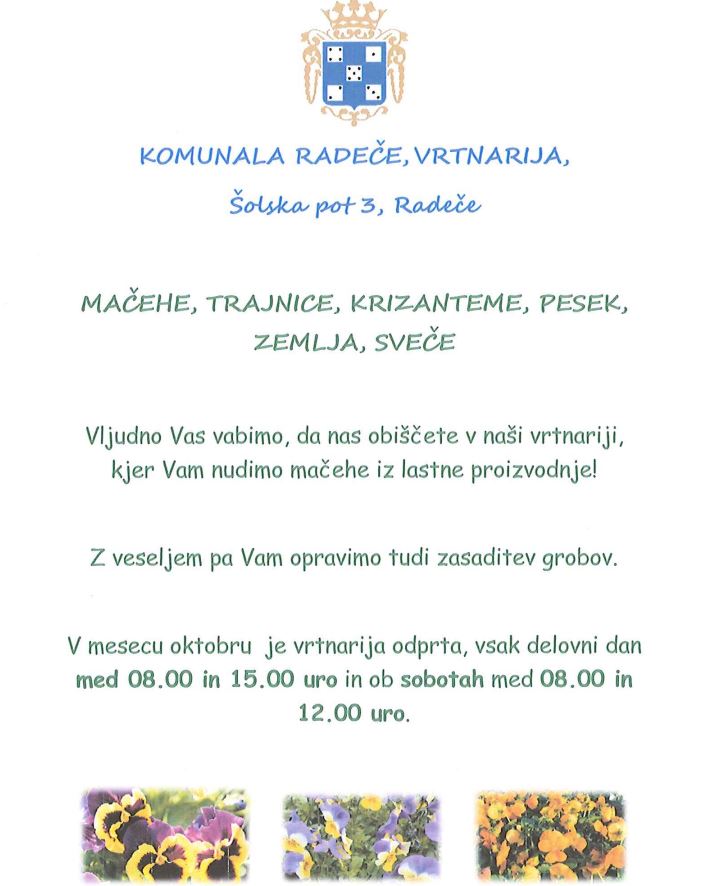 Komunala Radeče - Vrtnarija vabi, da jih obiščete na Šolski poti 3 v Radečah, v njihovi vrtnariji, kjer nudijo mačehe iz lastne proizvodnje, glede na dogovor oz. naročilo pa se lotevajo tudi zasaditev grobov. V oktobru je Vrtnarija Komunale Radeče odprta vsak delovni dan med 8. in 15. uro in ob sobotah med 8. in 12. uro.