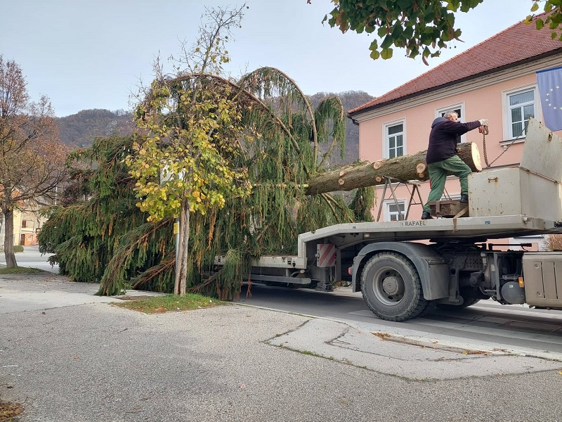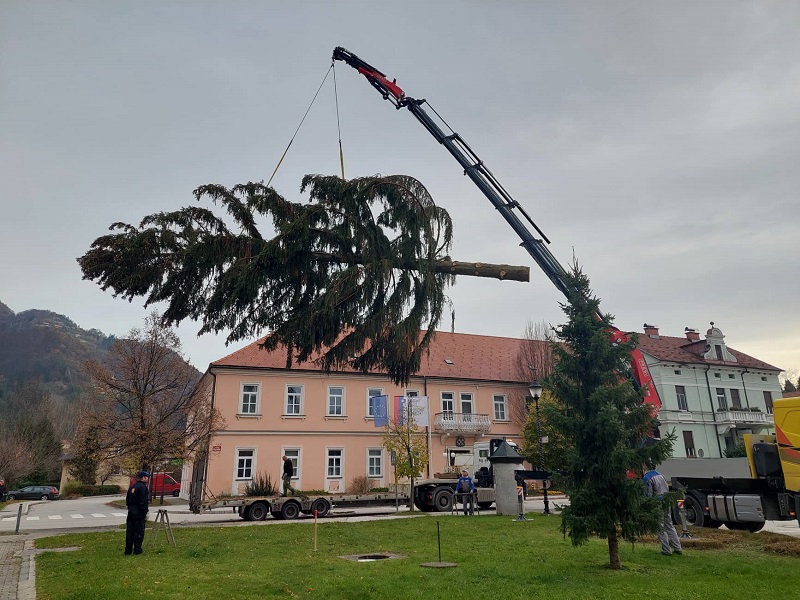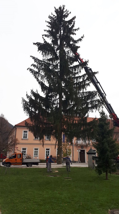 V včerajšnjem dopoldnevu je potekal posek smreke in prevoz le-te od mesta, kjer je pridobila na svoji višini in obsegu debla ter vse do mesta, kjer bo razveseljevala tekom prihajajočega veselega decembra. Zjutraj so izbrano smreko požagali, jo naložili in prepeljali v dolino, kjer so jo v središču mesta, v parku pred občinsko zgradbo blizu poldneva nato postavili, do večera pa so nanjo že bile nameščene tudi lučke.