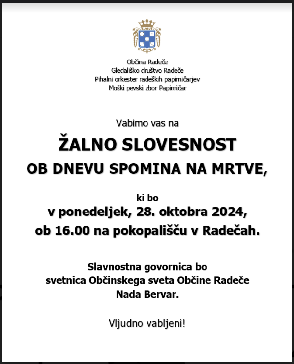 Pred prihajajočim dnevom reformacije in dnevom spomina na mrtve Občina Radeče v vlogi organizatorja in Gledališko društvo Radeče, ki bo kot že večkrat v preteklosti, prevzelo kulturni del dogodka nase, v ponedeljek, 28. oktobra 2024 ob 16. uri pripravljata žalno slovesnost, ki bo potekala na radeškem pokopališču. Slavnostni nagovor ob tej priložnosti bo zbranim namenila občinska svetnica Nada Bervar.