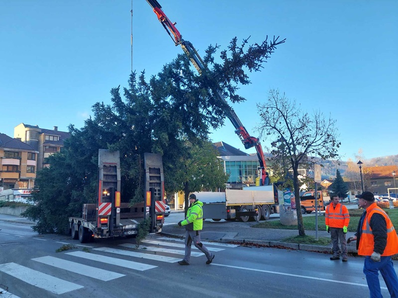 V včerajšnjem jutru so uslužbenci Komunale Radeče in podjetja Rafael (Sevnica) s skupnimi močmi podrli, transportirali in postavili smreko, ki bo v veselem decembru razveseljevala ob pogledu na lučke na njej in dekoraciji okoli nje. Prav prikladno pa je nato v noči iz včeraj na danes zapadel še prvi sneg in naznanil, da je začelo dišati po zimi in po bližajočih se praznikih.