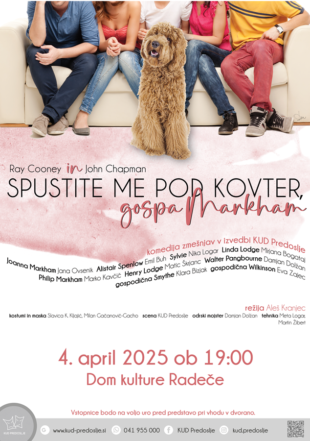 Gledališko društvo Radeče danes zvečer (ob 19.00 v Domu kulture Radeče) organizira še zadnjo abonmajsko predstavo, ki jo bodo izvedli člani in članice KUD Predoslje, ki prihajajo v goste v Radeče s komedijo Spustite me pod kovter, gospa Markham. Z današnjo igro se zaključuje gledališki abonma za odrasle v gledališki sezoni 2024/2025.