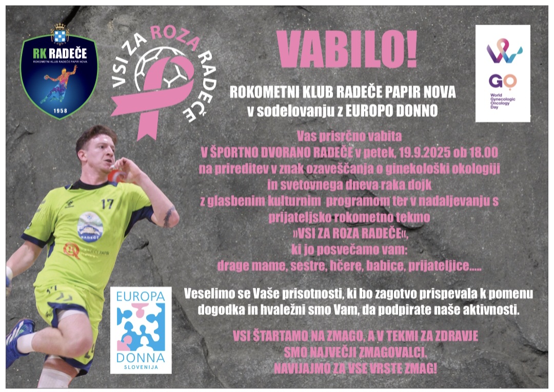 Športna dvorana Radeče bo v petek, 19. septembra, ob 18. uri gostila poseben dogodek, ki bo namenjen osveščanju o raku rodil in raku dojk. Skozi prijateljsko tekmo, na kateri bodo igralci nosili ozaveščevalne barve (roza in vijolične) bo namenjenih nekaj aktivnosti povezaovanju športa- gibanja, ozaveščanja, preventivi in tudi za otroke bo na zabaven način poskrbljeno, da se bodo česa koristnega v smislu preprečevanja bolezni ali njihovega zgodnjega odkrivanja, naučili. Med drugimi bodo navzoči minister za gospodarstvo, turizem in šport, domačin, Matjaž Han, predsednica Združenja Europa Donna Darja Molan in rojakinja iz bližnje Loke Jana Koteska, prav tako z izkušnjo, povezano z rakom, ker se septembra obeležuje občinski praznik, pa se bo manjkal niti domači župan Tomaž Režun.