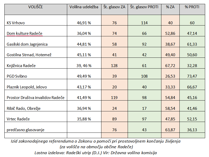 Če primerjamo število volišč, teh je skupno enajst, se je na šestih tehtnica prevesila na odločitev PROTI, na petih pa ZA. Za spoznanje je odločitev, ki je prevagala v Radečah, torej čez prst rečeno, PROTI Zakonu o pomoči pri prostovoljnem končanju življenja.
