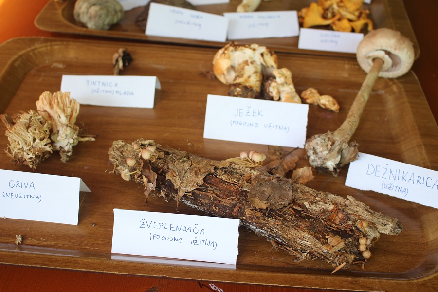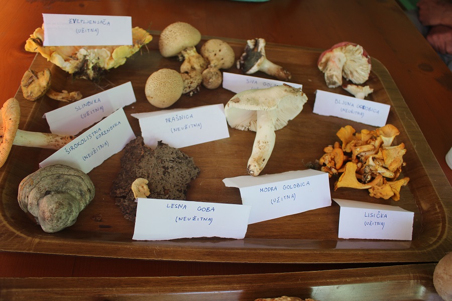 Gobe so nato pri lovski koči razporedili na pladnje, jih opremili z lističi, na katere so napisali imena gob ter tako tudi sošolcem približali del znanja, ki so ga skozi sprehod po gozdu in travnih pridobili zahvaljujoč ljubiteljskima gobarjema.
