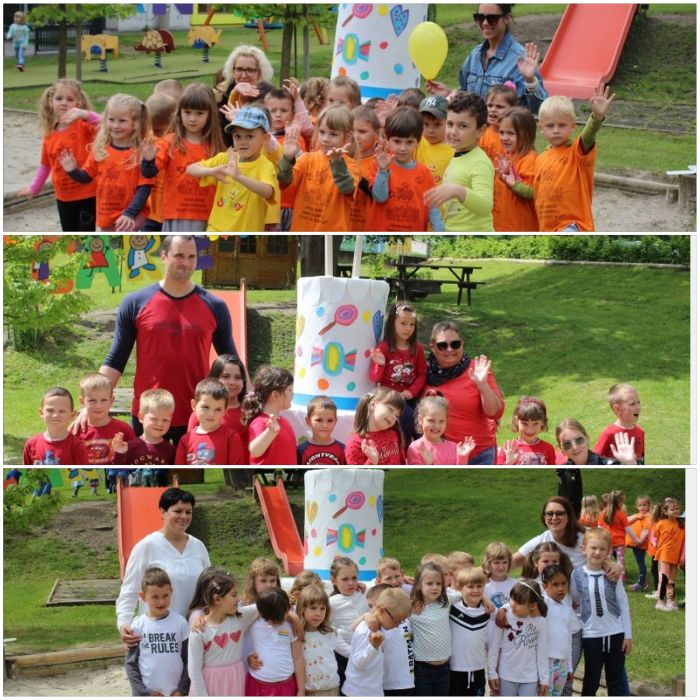 Otroci so bili odeti v barvno usklajena oblačila glede na njihovo vključenost v oddelke, in razporejeni v majhne skupine na površini igrišča okrog velike torte so izoblikovali pisane cvetove rože - okrog bele tortne sredine z velikim napisom 50 so bili tako beli, rdeči, rožnati, modri, beli in zeleni. V letošnjem celotnem vrtčevskem letu 2020/21 sicer praznujejo z različnimi drobnimi aktivnostmi, danes pa so vili Bibi Čari skupaj zapeli in podarili slikanico ter zasadilo okrasno češnjo.