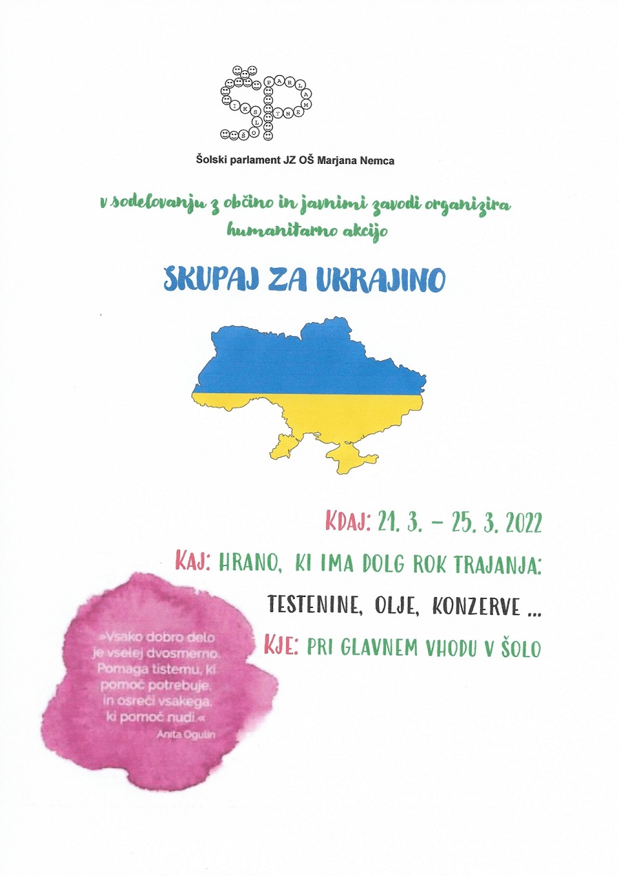 Šolski parlament javnega zavoda OŠ Marjana Nemca Radeče v sodelovanju z Občino Radeče in ostalimi javnimi zavodi v radeški občini organizira humanitarno akcijo SKUPAJ ZA UKRAJINO. Med 21. in 25. marcem bodo pri glavnem vhodu v šolo zbirali hrano z daljšim rokom trajanja (testenine, olje, konzervirana živila, ...).