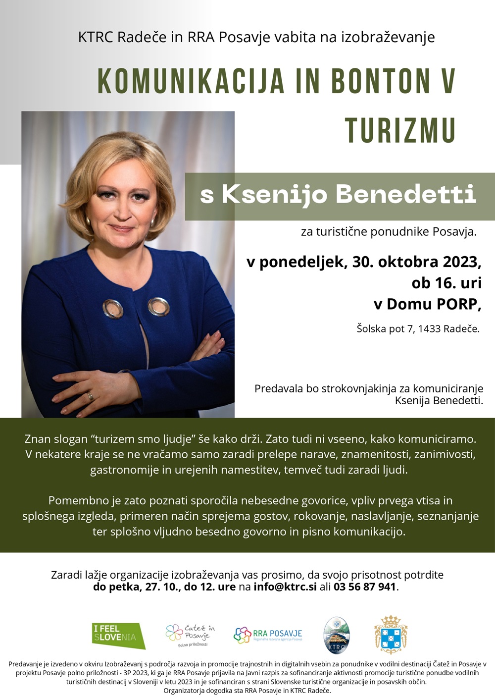 Za strokovnjakinjo za komuniciranje Ksenijo Benedetti malokdo še ni slišal, bila je namreč dolgoletna nekdanja šefinja državniškega protokola, ki ima poslovno in diplomatsko komunikacijo v vseh oblikah v malem prstu. V ponedeljek prihaja v Radeče, da vsem, ki delujejo na področju turizma razširi obzorja na temo "Komunikacija in bonton v turizmu."
