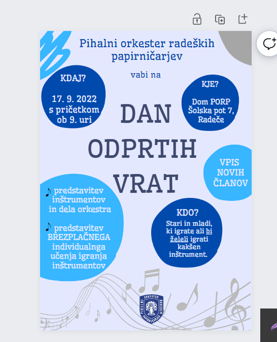 V soboto, 17. septembra bo ob 9. uri v Domu PORP potekala predstavitev inštrumentov in predstavitev dela Pihalnega orkestra radeških papirničarjev. Hkrati bodo v sklopu njihovega dneva odprtih vrat predstavili še brezplačno individualno učenje igranja na instrument. To bo tudi priložnost za vpis novih članov.