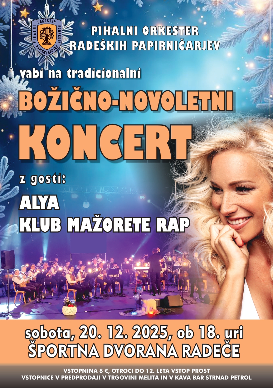 Praznične dni bo Kulturno društvo Pihalni orkester radeških papirničarjev tudi letos popestrilo s tradicionalnim koncertom, ki bo potekal to soboto, 20. decembra 2025 ob 18. uri, pripravljen pa bo v sodelovanju s pevko zabavne glasbe Alyo in Klubom Mažorete RAP. Vstopnice so v predprodaji na voljo v Trgovini Melita in v Kava Bar-u Strnad na Petrolu Radeče.