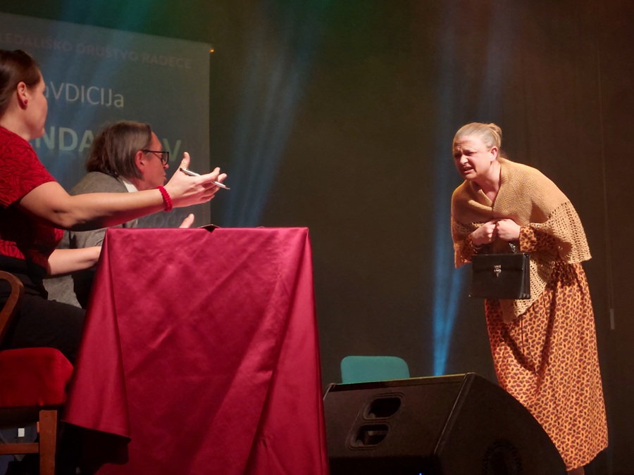 Prva je na oder stopila Vesna Močilar ter navdušila v vlogi naglušne in ostarele Ani Perc, namišljene članice Društva kmečkih žena Arnika s Svibna, ki se je prišla pohvaliti kot pevka, k petju pa je pripravila tudi obiskovalce.