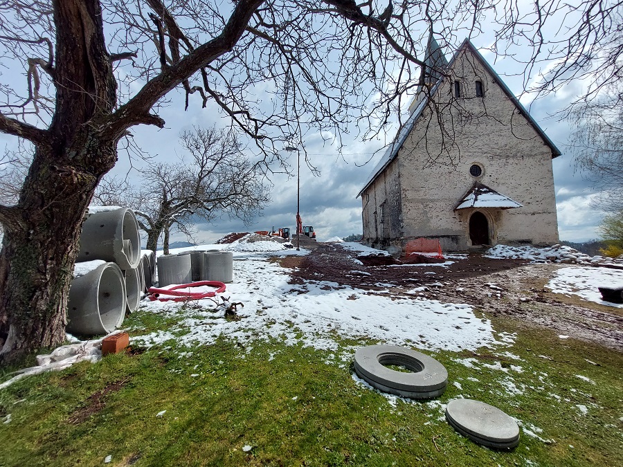 Na Brunku se je 1. marca začela obnova temeljev, drenaža in sanacija notranjih spodnjih delov sten. Del sredstev je zagotovila država, del pa jih želi Župnija Radeče zbrati tudi z akcijo darovanja lesa. Kako napredujejo dela, je Radeški utrip skozi slike obeležil ravno na prvo aprilsko nedeljo, ki je bila na Brunku in tudi marsikje drugod, odeta v snežno belino.