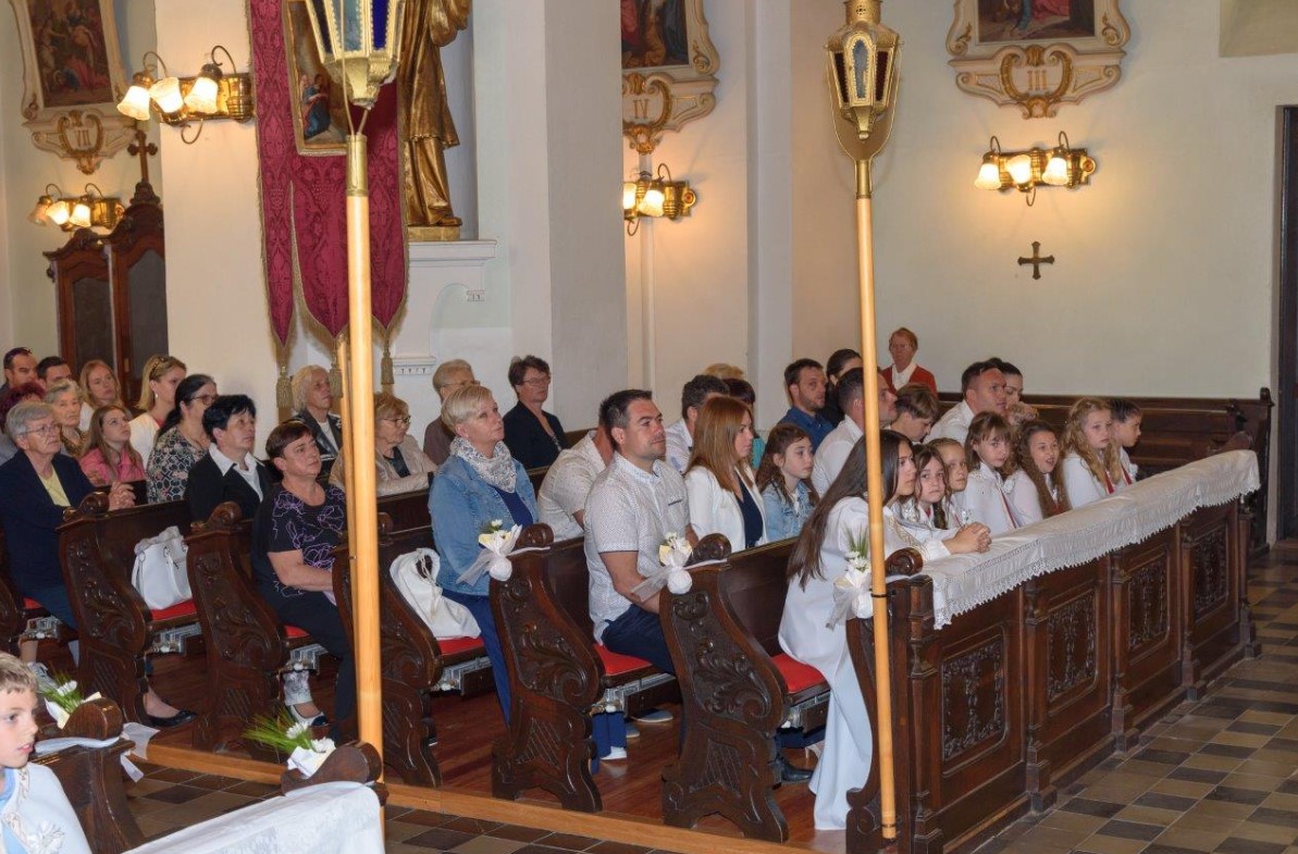 Binkoštna sončna nedelja je bila posebno doživeta, saj so prvoobhajanci v svečanih oblekah z veseljem pričakovali prejem Jezusa, se potrudili z mašnim sodelovanjem in petjem. Po končanem obredu je sledilo fotografiranje in pogostitev v Domu svetega Petra.