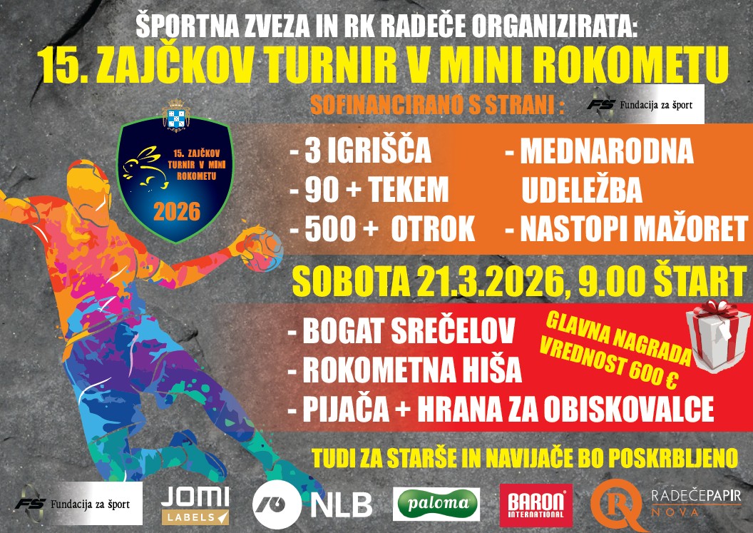 Tudi v letošnjem predvelikonočnem času bo v Radečah potekal največji turnir v MINI ROKOMETU v Sloveniji. To soboto, 21. marca, Rokometni klub Radeče Papir Nova in Športna zveza Radeče namreč pripravljata že 15. Zajčkov turnir po vrsti.