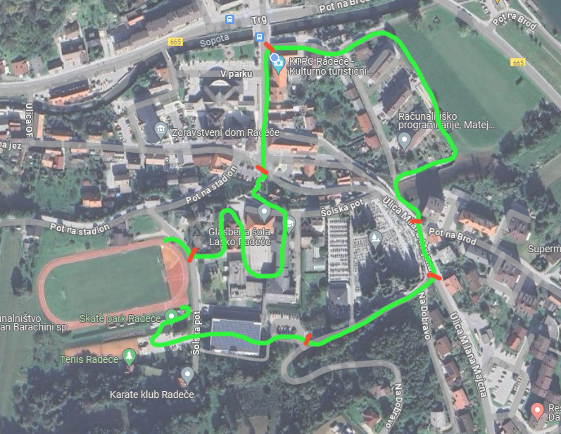 V Radečah bo svojo pot začela na stadionu, od koder bo ponesena mimo večina športnih objektov: športne dvorane, rolkarskega in tenis igrišča, balinišča, otroških igral nasproti TRC Savus (na koncu/začetku drevoreda japonskih češenj) ter mimo KTRC Radeče in stavbe Občine Radeče, predvidoma bo potovala tudi skozi območje radeške šole, mimo šolskega igrišča in Doma pihalnega orkestra radeških papirničarjev, mimo vrtca ter se nato vrnila na izhodiščno mesto - na stadion. Tako se bo sklenil krog potovanja olimpijskega ognja s slovenskim pridihom.